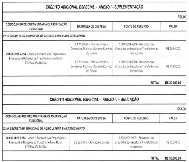 Art. 1º Fica aberto no Orçamento Municipal 2025, Lei nº 1729, de 27 de dezembro de 2024, crédito adicional especial no valor de R$ 30.000,00 (trinta mil reais), para atender à programação constante do Anexo I desta Lei.